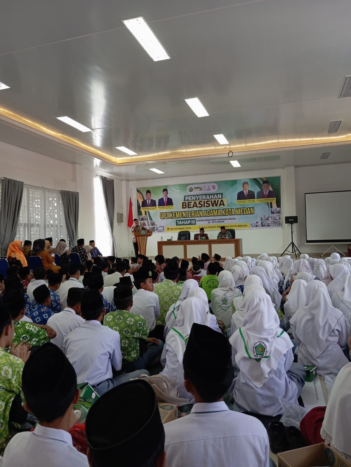 Medan (Humas) — Sebanyak 15 siswa MIN 5 Kota Medan menerima beasiswa dari Unit Pengumpul Zakat (UPZ) Kantor Kementerian Agama Kota Medan pada penyaluran tahap ketiga yang digelar di Aula PLHUT Kemenag Kota Medan, Jalan Sei Batugingging, Rabu (8/10/2025). Acara berlangsung khidmat dan penuh rasa syukur, dihadiri ratusan pelajar penerima beasiswa dari jenjang MIN, MTsN, hingga MAN se-Kota Medan.