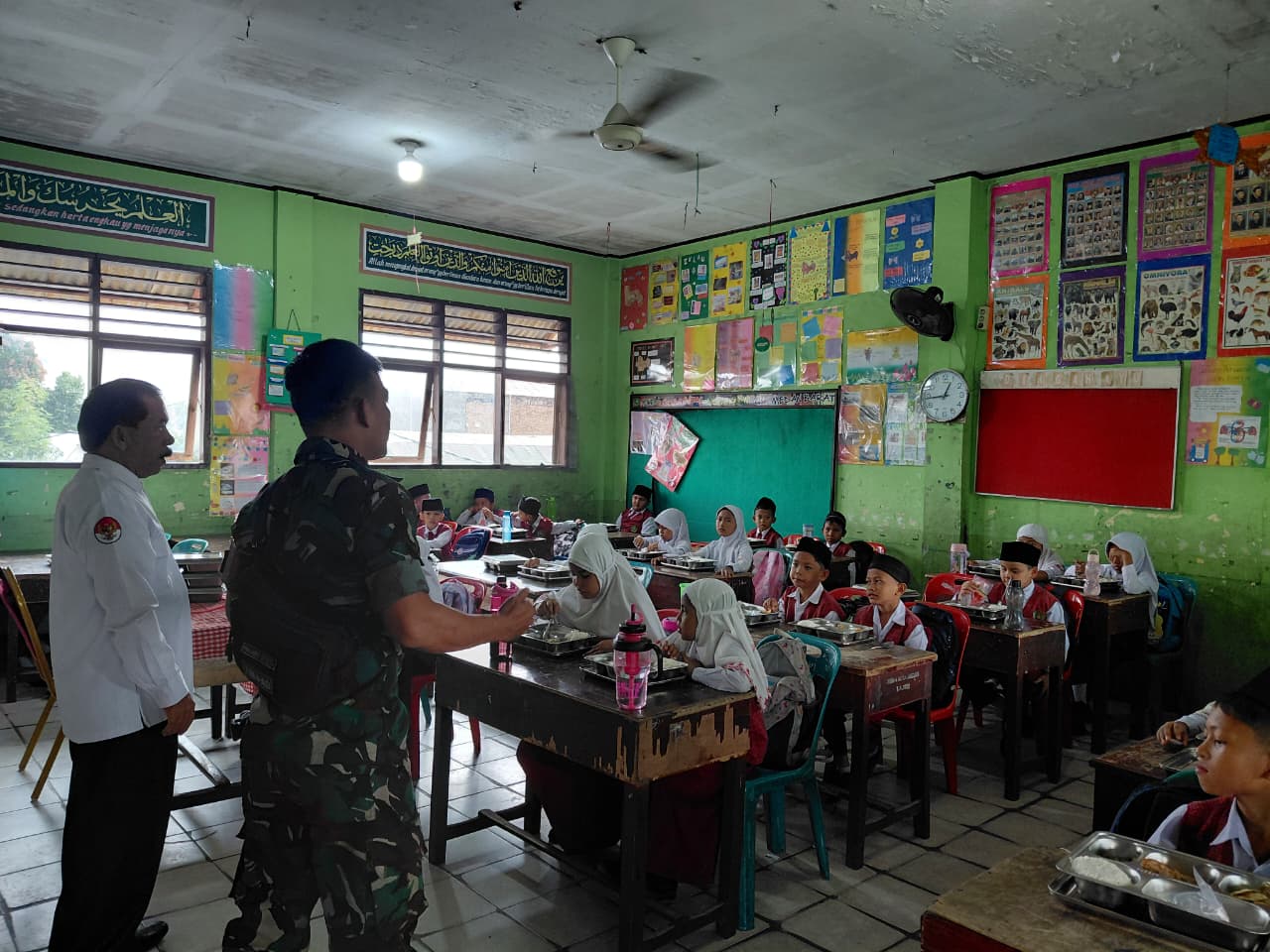 Sertu Wahyudi turut melakukan pengawasan selama proses pendistribusian agar bantuan makanan diterima secara merata oleh seluruh siswa. Selain itu, kehadiran Babinsa juga memberikan rasa aman dan memastikan kegiatan berjalan sesuai dengan ketentuan yang telah ditetapkan.