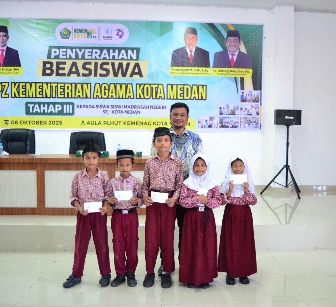 Medan (Humas) – Suasana haru dan bahagia menyelimuti Aula Pusat Layanan Haji dan Umrah Terpadu Kantor Kementerian Agama Kota Medan saat para siswa MIN 2 Kota Medan menerima beasiswa dari Unit Pengumpul Zakat (UPZ) Kemenag Kota Medan. Momen penuh berkah ini menjadi wujud nyata kepedulian Kementerian Agama terhadap dunia pendidikan, khususnya bagi peserta didik madrasah yang berprestasi dan membutuhkan dukungan finansial untuk melanjutkan pendidikan mereka. (08/10)