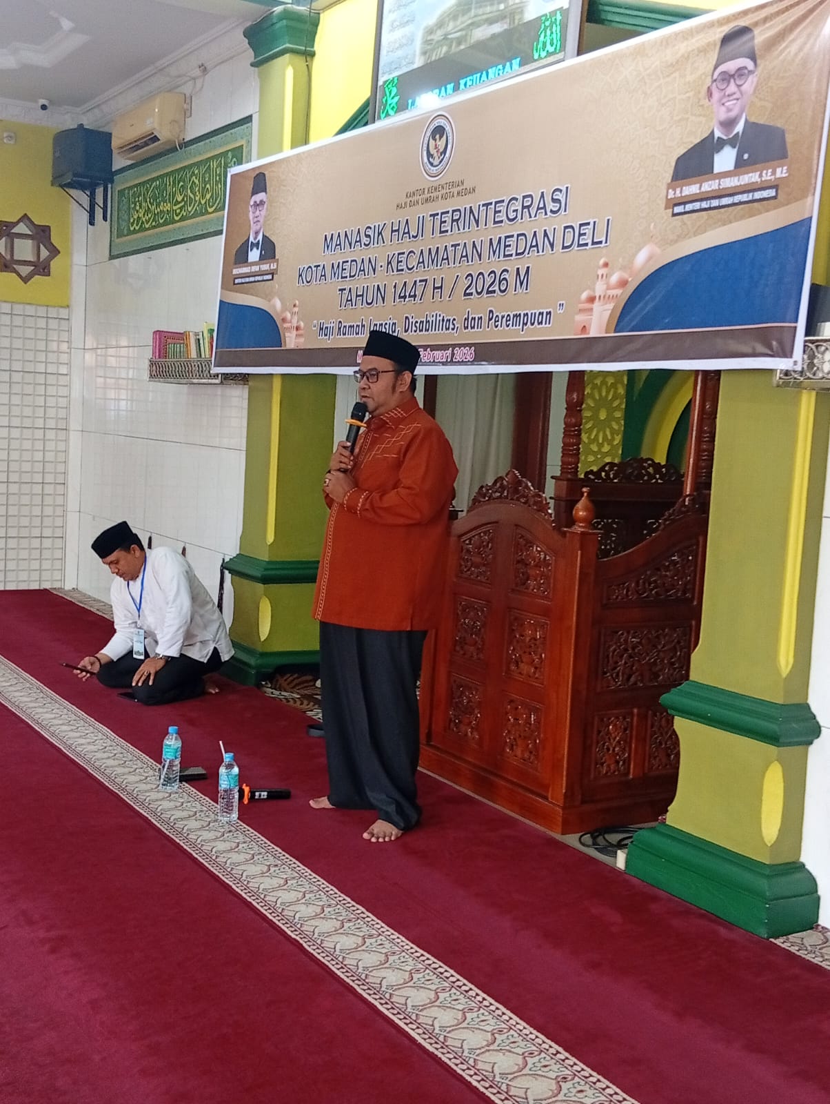 Medan (Humas) – Bimbingan manasik haji terintegrasi bagi calon jamaah haji terus digelar di berbagai kecamatan. Kali ini kegiatan dilaksanakan di Masjid Ar Ridho, Jalan Aluminium I Medan, Ahad (8/2/2026), dengan menghadirkan Penyuluh Agama Islam KUA Kecamatan Medan Baru, Damri Tambunan, sebagai narasumber.