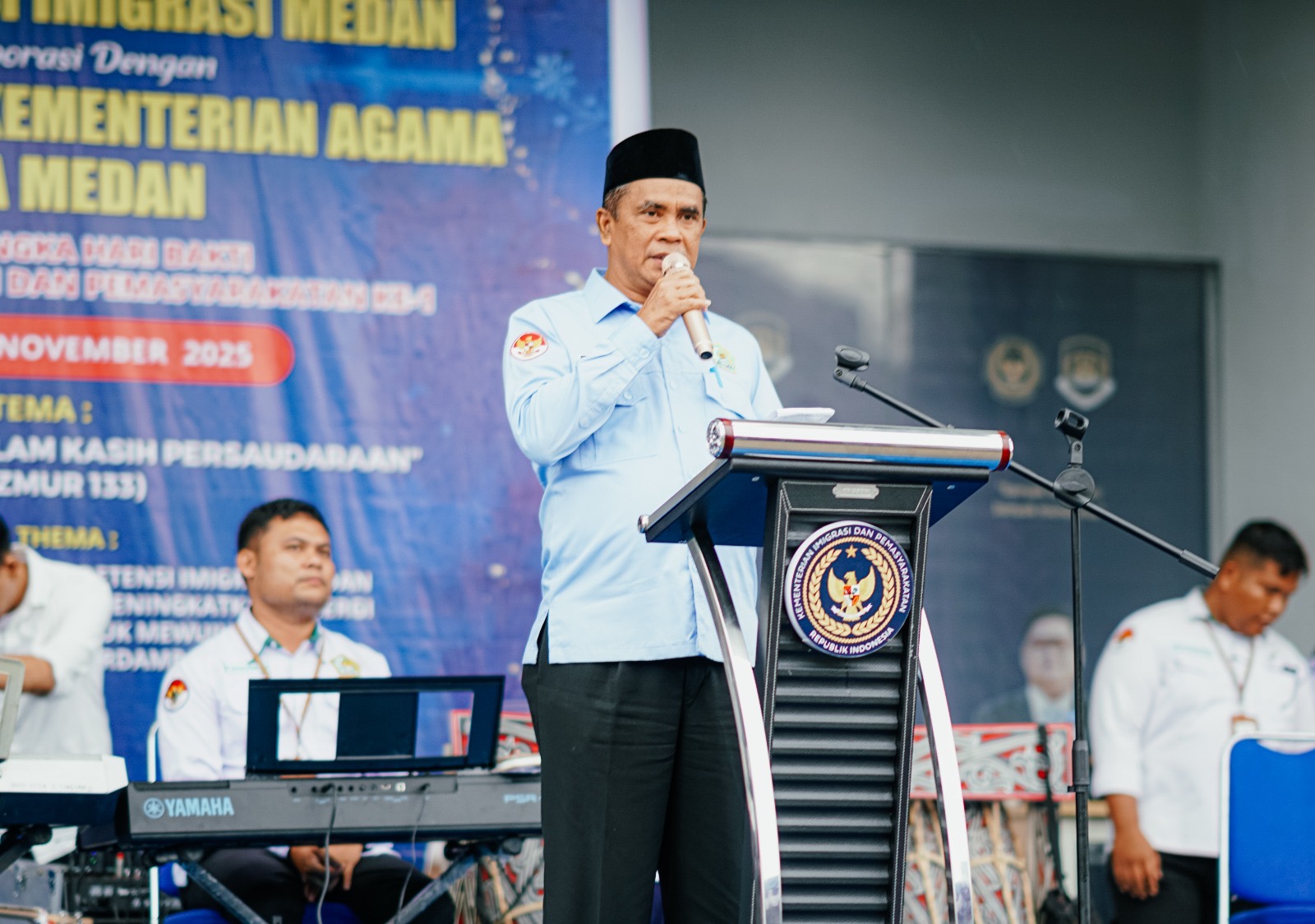 Medan (Humas) — Kepala Kementerian Agama Kota Medan, Dr. H. Impun Siregar, MA, memberikan pesan penting mengenai arti persaudaraan, pelayanan, dan sinergi antar lembaga saat menghadiri Ibadah Raya yang digelar Rumah Detensi Imigrasi (Rudenim) Medan bekerja sama dengan Bimas Kristen Kemenag Kota Medan, Selasa (25/11/2025) di Kompleks Mabar Hilir, Medan Deli.