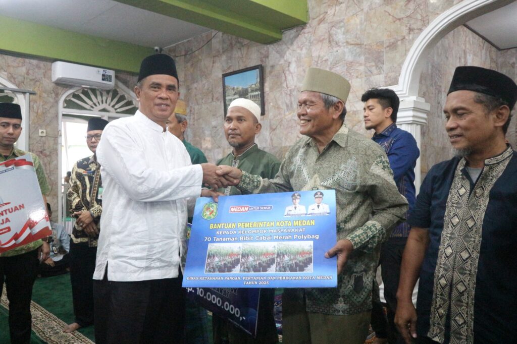 Setelah pelaksanaan Salat Jumat yang dipimpin Khatib dan Imam Anwar Syahadat, Pemko Medan menyerahkan beberapa bantuan, di antaranya hibah Rp50 juta untuk rehabilitasi masjid, bantuan sosial Rp10 juta, 70 polibag bibit cabai, satu set tenis meja, dan satu rak buku beserta isinya.