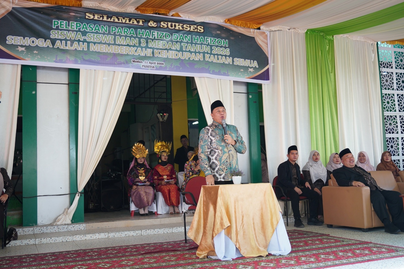 Medan (Humas)–Kepala Kantor Wilayah Kementerian Agama Sumatera Utara H. Ahmad Qosbi, S.Ag., MA menghadiri acara Pelepasan Hafiz dan Hafizah Kelas XII TP 2025-2026 di lapangan MAN 3 Medan, Sabtu (11/04/2026).