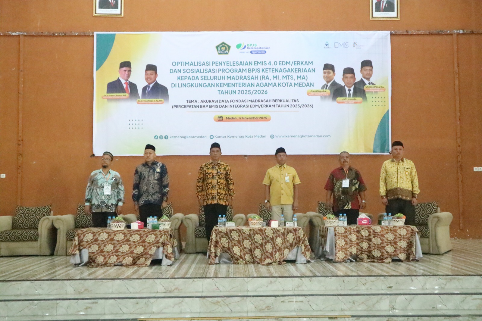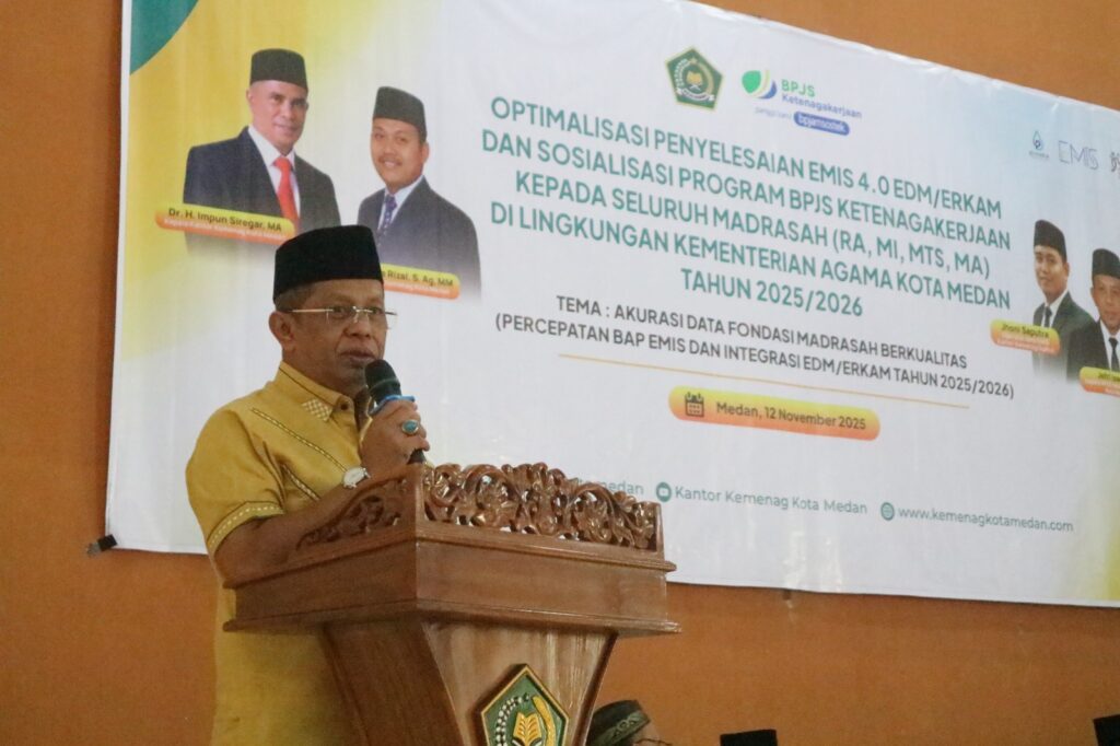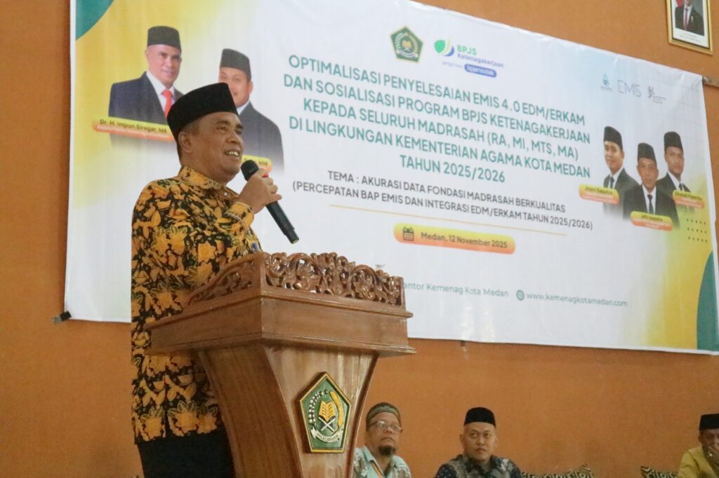 Medan (Humas) — Kementerian Agama Kota Medan bekerja sama dengan BPJS Ketenagakerjaan menggelar kegiatan sosialisasi program perlindungan kerja bagi guru dan tenaga kependidikan madrasah, yang berlangsung di Aula Madinatul Hujjaj Asrama Haji Medan, Rabu (12/11/2025).