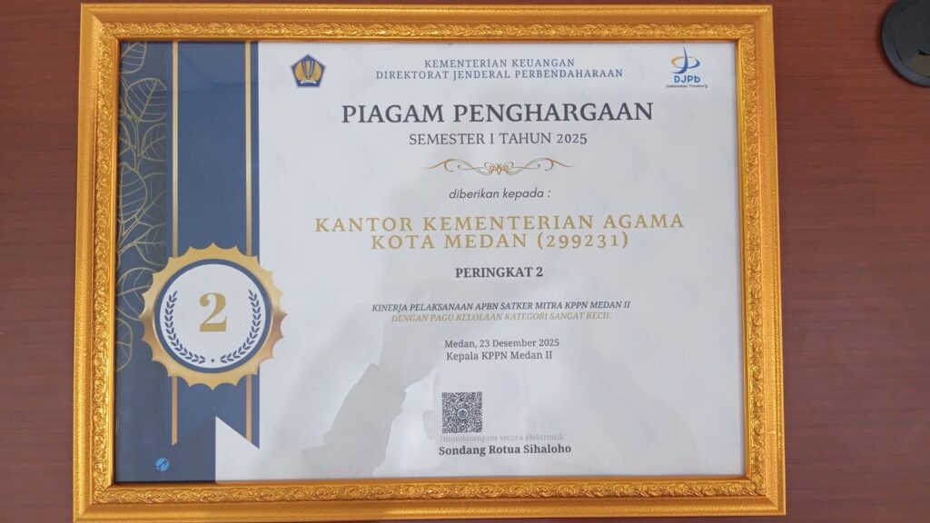 Medan (Humas) — Kantor Kementerian Agama Kota Medan kembali menorehkan prestasi membanggakan di bidang pengelolaan keuangan negara. Pada Semester I Tahun 2025, Kemenag Kota Medan berhasil meraih Peringkat II Kinerja Pelaksanaan APBN Satker Mitra KPPN Medan II dengan Pagu Kelolaan Kategori Sangat Kecil. Senin (26/1/2026).