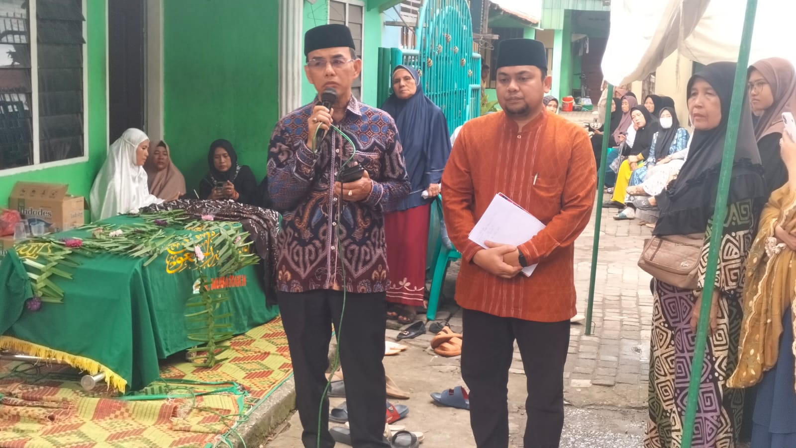 Medan (Humas) Kepala Kantor Urusan Agama (KUA) Kecamatan Medan Sunggal, H. Agus Salim, S.Ag., M.Pd.I., menyampaikan kata sambutan penuh duka dalam prosesi pelepasan jenazah almarhumah Sapriyanti binti Saimin yang wafat pada usia 55 tahun. Almarhumah merupakan istri dari Drs. H. Azhar, staf KUA Kecamatan Medan Sunggal. Prosesi berlangsung di rumah duka yang beralamat di JL. Pinang Baris, Gang Pendidikan Nomor 1A, Kelurahan Lalang, Kecamatan Medan Sunggal, pada Rabu, (1/4/ 2026).