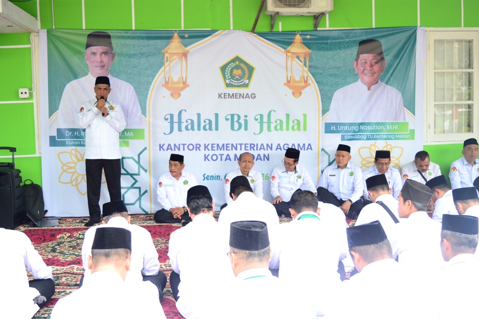 Medan (Humas) – Kantor Kementerian Agama Kota Medan menggelar kegiatan Halal Bihalal sebagai upaya mempererat ukhuwah Islamiyah dan silaturahmi antar Aparatur Sipil Negara. Kegiatan ini berlangsung dengan penuh kekhidmatan dan suasana kekeluargaan. Undangan resmi telah disampaikan kepada seluruh jajaran di lingkungan Kementerian Agama Kota Medan. Acara ini menjadi momentum penting pasca Hari Raya Idulfitri. Seluruh peserta tampak antusias mengikuti rangkaian kegiatan. Kepala MIN 5 Medan, Sri Darmawati, S.Pd., turut menghadiri langsung kegiatan tersebut.