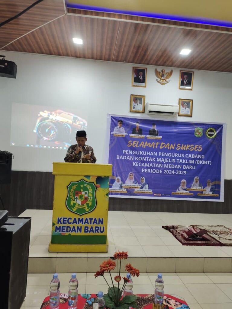 Medan (Humas) — Kepala Kantor Urusan Agama Kecamatan Medan Baru, Julhaidir Sembiring, M.Ag., menghadiri sekaligus memberikan dukungan penuh pada acara Pengukuhan Pengurus Cabang Badan Kontak Majelis Taklim (BKMT) Kecamatan Medan Baru Periode 2024–2029. Kegiatan ini dilaksanakan pada Kamis, 11 Desember 2025, bertempat di Aula Kantor Kecamatan Medan Baru, dan menjadi momentum penting dalam memperkuat pembinaan keagamaan di lingkungan masyarakat.