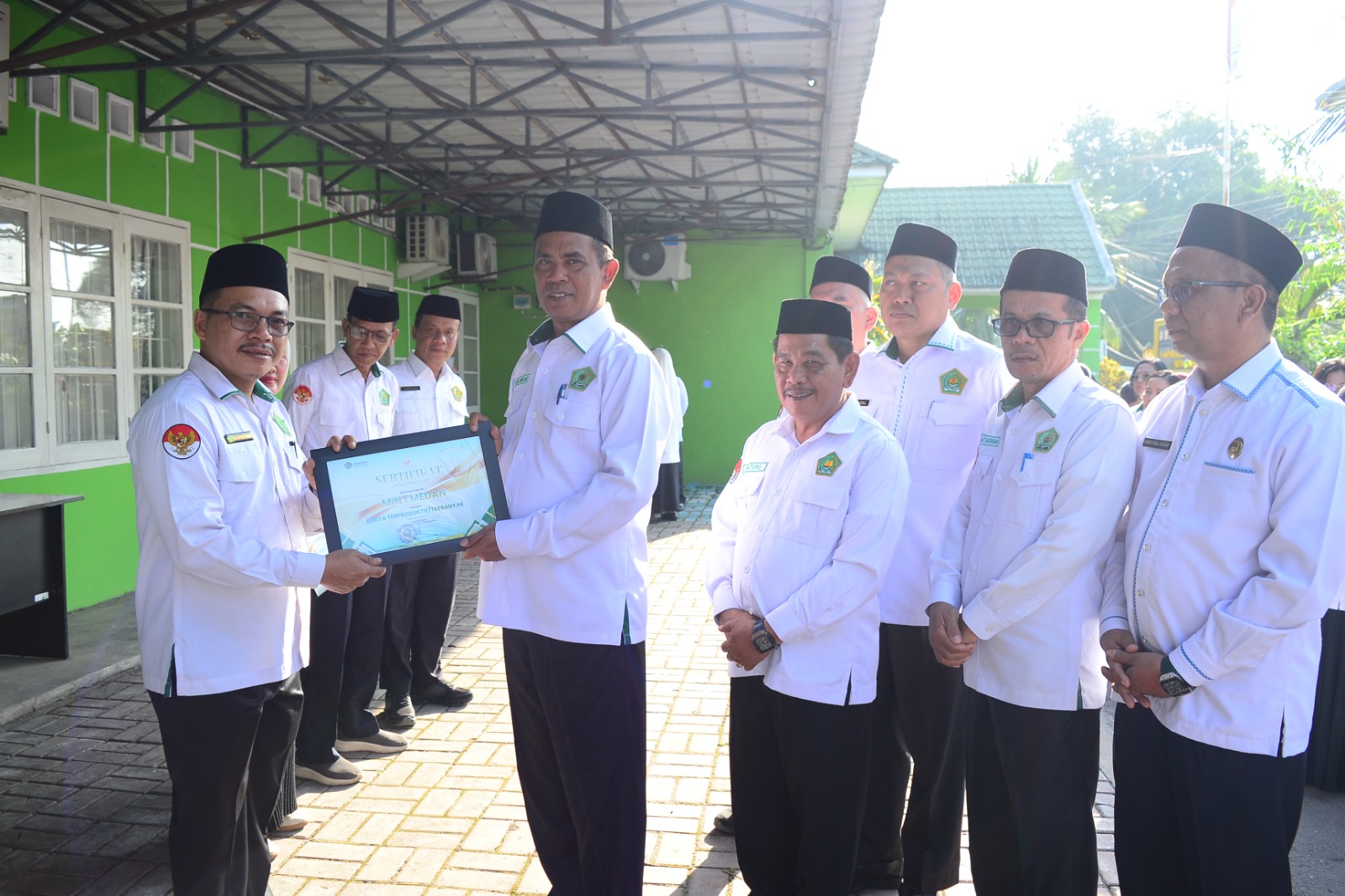 Penyerahan penghargaan dilakukan langsung oleh Kepala Kantor Kementerian Agama Kota Medan, Dr. Impur Siregar, M.A., bertempat di Lapangan Utama Kemenag Kota Medan. Kegiatan tersebut berlangsung dengan khidmat dan diikuti oleh kurang lebih 20 kepala madrasah dari berbagai jenjang, mulai dari MIN, MTsN, hingga MAN.