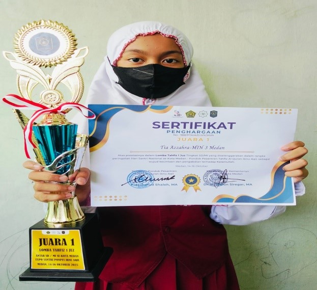 Medan (Humas) Kabar membanggakan datang dari MIN 3 Kota Medan. Tia Azzahra, berhasil meraih Juara 1 dalam Lomba Tahfiz 1 Juz Tingkat SD/MI yang digelar dalam rangka peringatan Hari Santri Nasional se-Kota Medan.