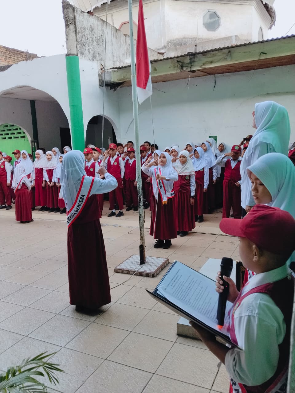 Upacara bendera berlangsung tertib dan khidmat di halaman madrasah. Bertindak sebagai pembina upacara, Sri Hidayah, S.Pd., yang menyampaikan amanat tentang pentingnya disiplin, tanggung jawab, serta semangat belajar bagi para siswa.