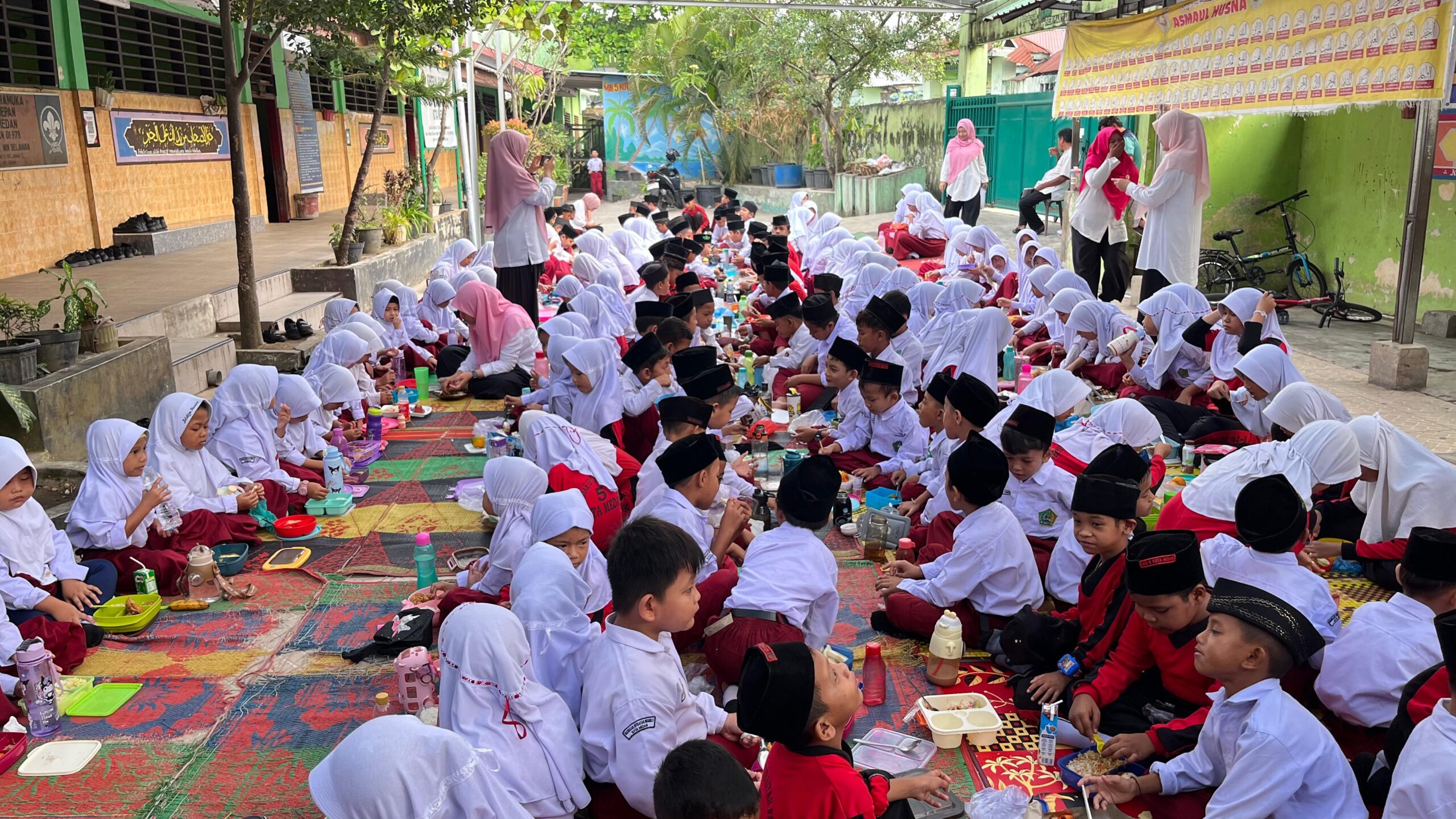 Beragam menu sehat terlihat memenuhi halaman madrasah, mulai dari nasi, lauk pauk bergizi, sayur-mayur, buah-buahan, hingga susu. Bekal lengkap yang dibawa siswa menunjukkan tingginya kepedulian keluarga terhadap pemenuhan gizi seimbang bagi anak-anak.