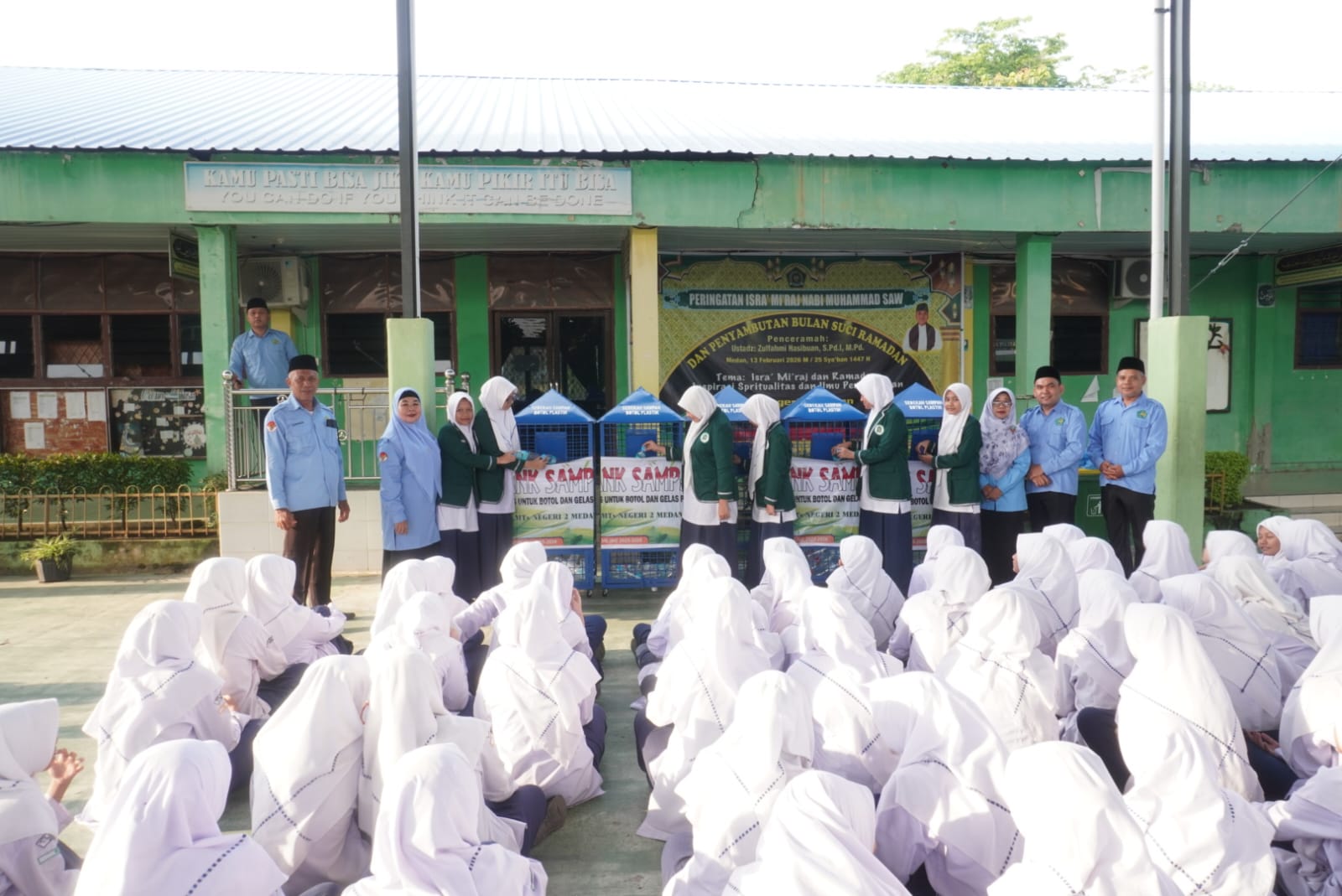 Kegiatan ini dilaksanakan di Lapangan Serbaguna MTsN 2 Medan pada Rabu (1/4/2026), dengan dihadiri oleh seluruh siswa. Dalam kegiatan tersebut, dilakukan penyerahan lima unit bank sampah dari orang tua murid yang secara simbolis diserahkan oleh Kepala MTsN 2 Medan kepada Koordinator Lingkungan Hidup.