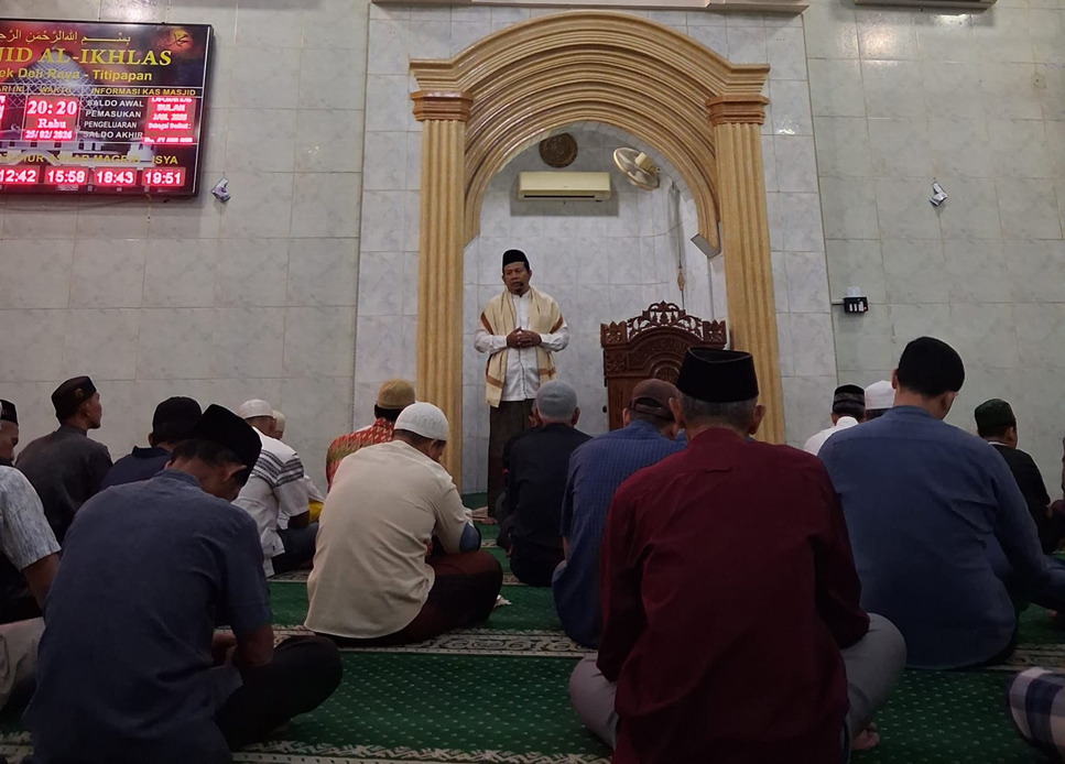 Medan (Humas) — Penyuluh Agama Islam Kecamatan Medan Amplas, Dr. Syarto, Lc., M.A., mengisi tausyiah ramadan 1447 Hijriah di Masjid Al-Ikhlas, Kelurahan Amplas, Kamis (26/2/2026). Kegiatan yang berlangsung khidmat tersebut dihadiri oleh Pengurus Badan Kemakmuran Masjid (BKM) Al-Ikhlas, H. Amrin, serta jamaah warga sekitar.