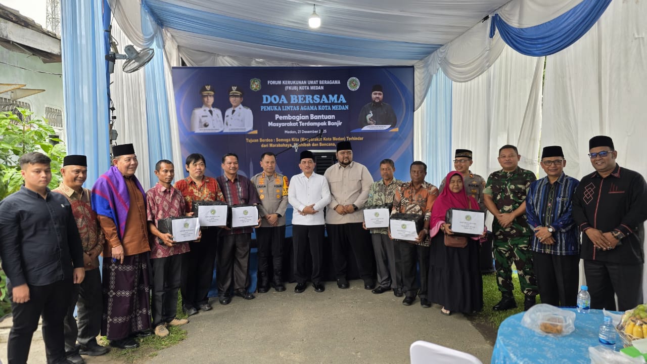 Medan (Humas) — Penyuluh Agama Islam Kecamatan Medan Baru bersama Damri Tambunan yang juga menjabat sebagai Sekretaris Forum Kerukunan Umat Beragama (FKUB) Kota Medan menghadiri kegiatan Doa Bersama Pemuka Lintas Agama Kota Medan yang dirangkai dengan penyaluran bantuan bagi masyarakat terdampak banjir. Kegiatan tersebut berlangsung di halaman Kantor FKUB Kota Medan, Minggu (21/12/2025).
