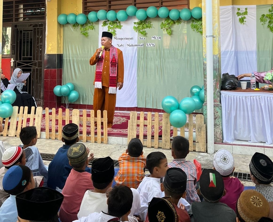 Medan (Humas) Penyuluh Agama Islam KUA Kecamatan Medan Sunggal, Paidi, S.Ag, memberikan tausiyah peringatan Isra Mi’raj sekaligus motivasi menyambut datangnya bulan suci Ramadan kepada siswa SD Inpres 060862 Medan, Jalan 5 Pulau Brayan Bengkel, Kota Medan, Sabtu (14/2/2026). Kegiatan ini diikuti oleh para siswa, guru, serta jajaran sekolah dalam suasana penuh khidmat dan semarak.