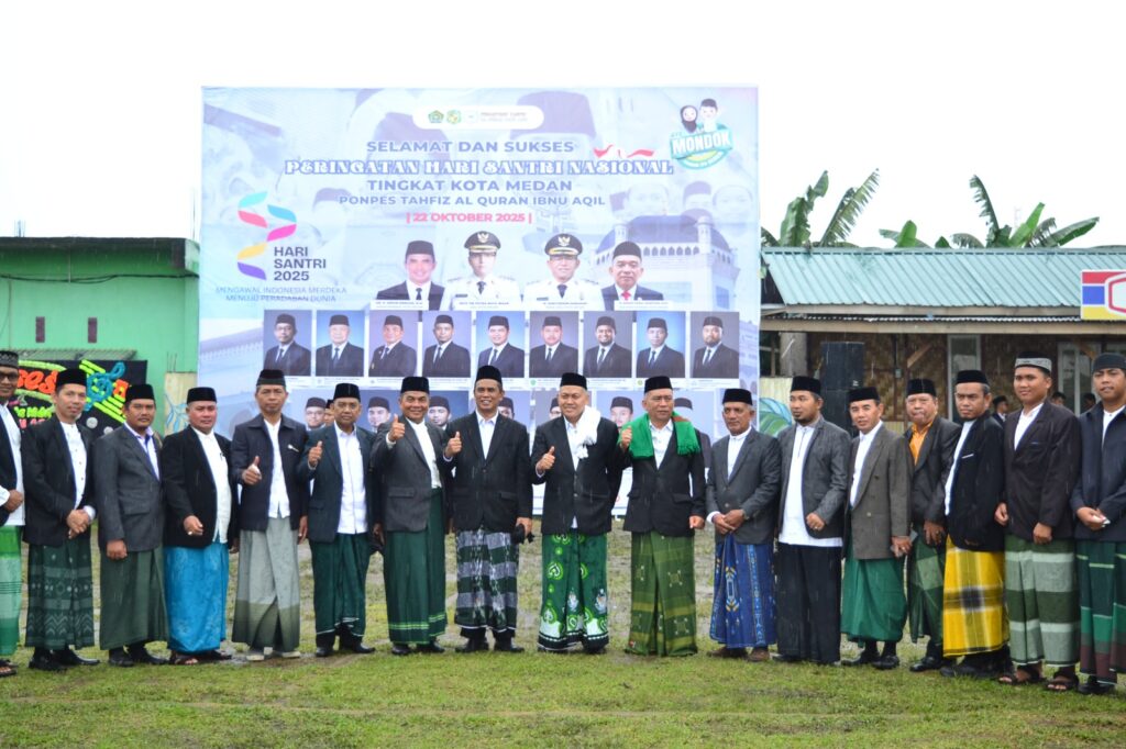 Medan (Humas) — Dalam semangat memperingati Hari Santri Nasional 2025, Kantor Kementerian Agama (Kemenag) Kota Medan bekerja sama dengan Pemerintah Kota Medan menggelar Upacara Peringatan Hari Santri di Pondok Pesantren Tahfiz Ibnu Aqil, Medan Labuhan, Rabu (22/10/2025). Mengusung tema “Mengawal Indonesia Merdeka Menuju Peradaban Dunia”, kegiatan ini menjadi momentum penting untuk mengapresiasi kontribusi besar kalangan santri dan pesantren dalam perjalanan bangsa.