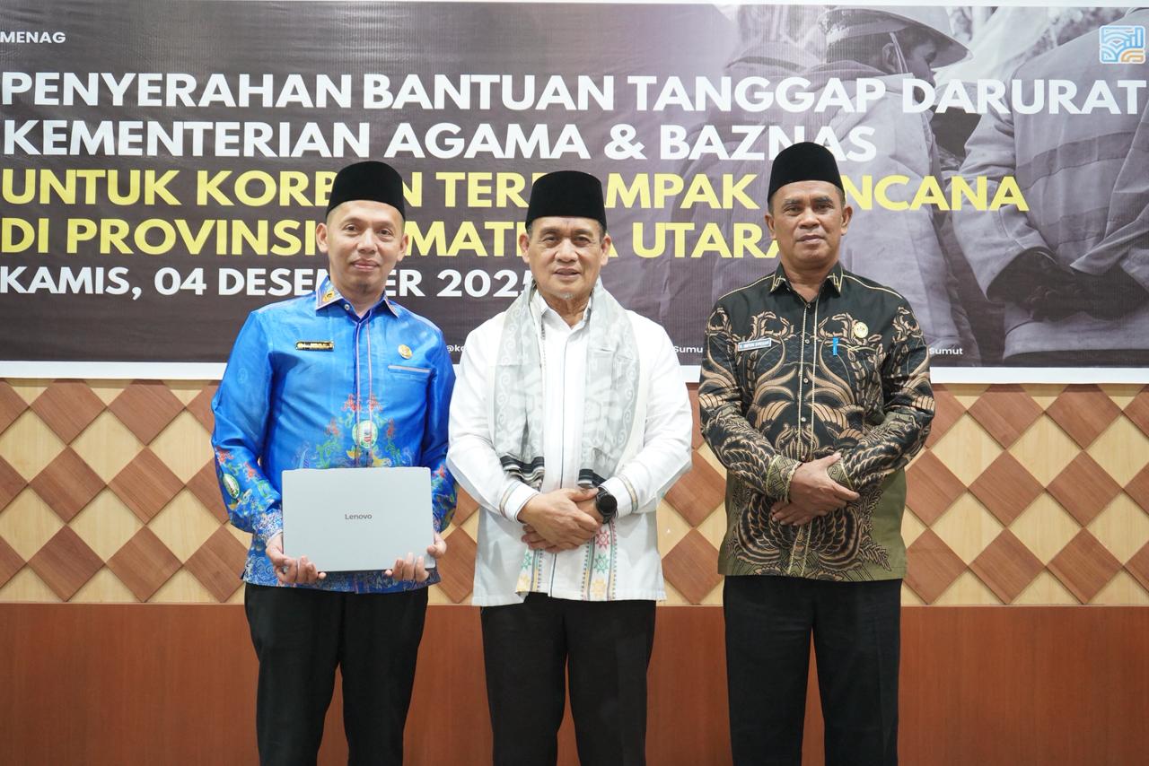 Medan (Humas). Wakil Menteri Agama RI Romo Raden Muhammad Syafii menyampaiakan apresiasi atas dedikasi Penghulu sekaligus Kepala Kantor Urusan Agama (KUA) Kecamatan Medan Perjuangan, H. Ramlan, MA, yakni pemberian sebuah perangkat laptop. Penyerahan laptop tersebut dilakukan sebagai bentuk apresiasi atas kegigihan Ramlan dalam melaksanakan tugas memberikan pelayanan pencatatan nikah. Laptop diberikan secara simbolis sewaktu pemberian bantuan kepada korban terdampak Bencana di Sumatera Utara bertempat di Aula Kantor Wilayah Kementerian Agama Provinsi Sumatera Utara, Kamis (4/12).